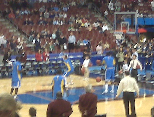 Was fortunate enough to spend the afternoon with K.C. at the Villanova/UCLA NCAA tournament game in Philadelphia. One of my vendors from work is a sponsor of the NCAA (please buy their product here) and provided some tickets so they were primo seats. 10th row, center court. I could have pegged Jay Bilas upside the head with soda cup we were that close (Don’t worry Dick Enberg & UCLA Dance Team, you’d both ok in my book and would be safe from the crossfire).